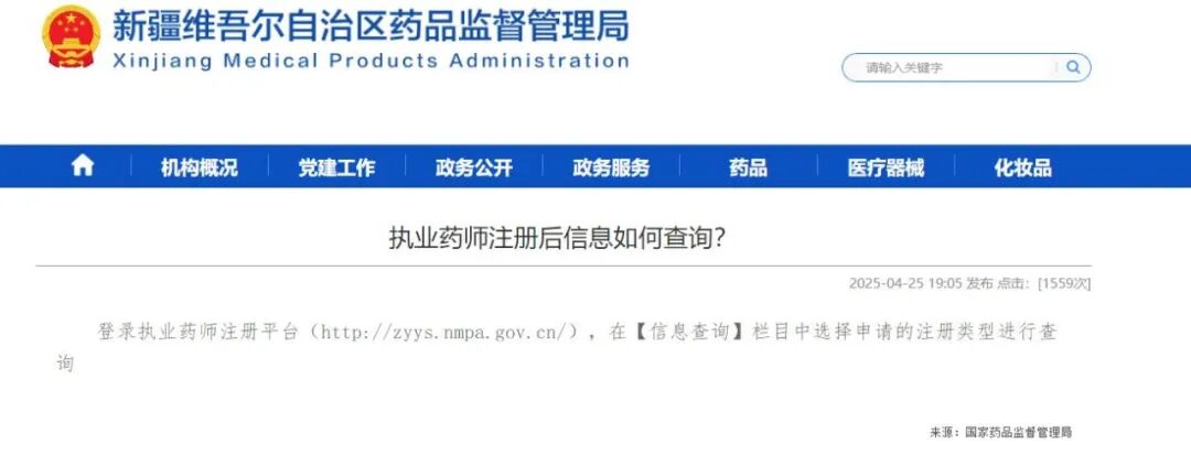 来源:国家药品监督管理局、新疆维吾尔自治区药品监督管理局 执业药师注册后信息如何查询?