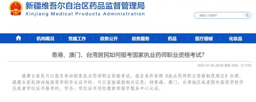 来源:国家药品监督管理局、新疆维吾尔自治区药品监督管理局 香港、澳门、台湾居民如何报考国家执业药师职业资格考试?