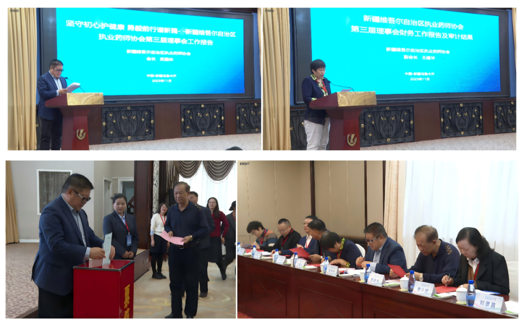 大会严格遵循法定程序,分三个阶段有序推进:第一阶段召开第四次会员代表大会,集中审议并表决《协会第三届理事会工作报告》《协会第三届理事会财务工作报告》《新疆执业药师协会第四届理事会换届选举办法》《换届大会总监票人、监票人、计票人产生说明及名单》《协会章程(修订草案)》《协会会费管理办法》等文件,同步选举产生第四届理事会理事和监事会监事;第二阶段分别召开第四届理事会第一次会议、监事会第一次会议,通过无记名投票方式选举产生新一届理事会、监事会领导机构;第三阶段继续召开会员代表大会,正式宣布选举结果并开展后续议程。