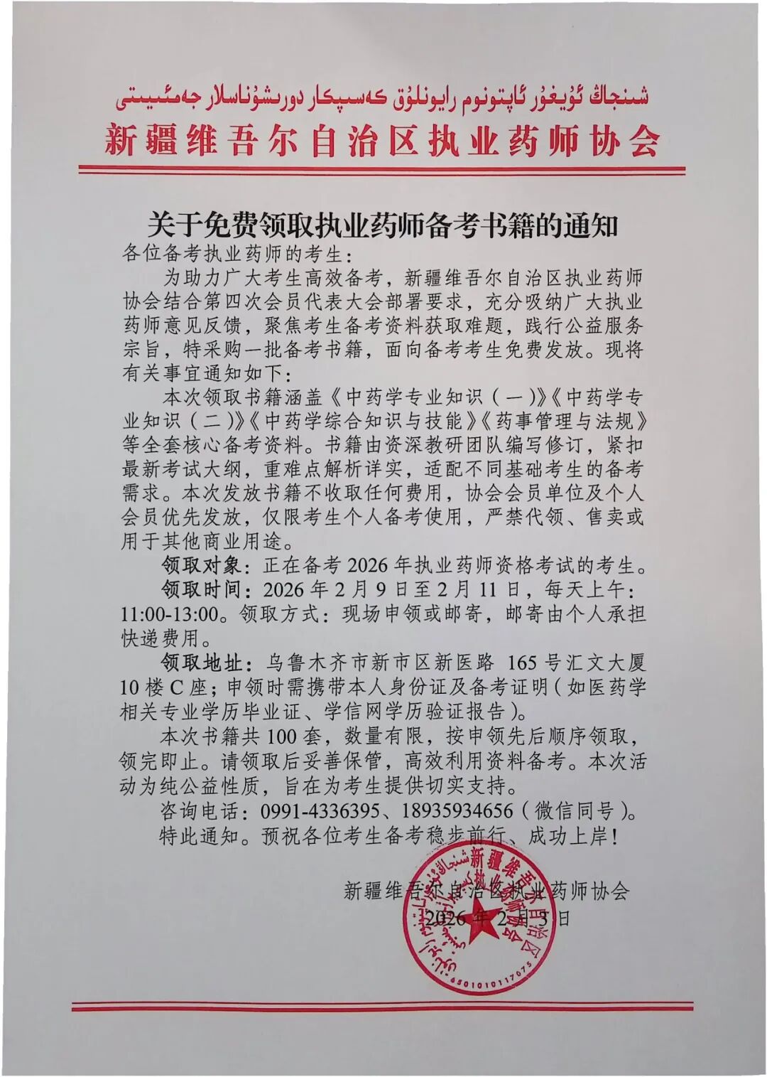 领取地址:乌鲁木齐市新市区新医路 165号汇文大厦10楼C座;申领时需携带本人身份证及备考证明(如医药学相关专业学历毕业证、学信网学历验证报告)。