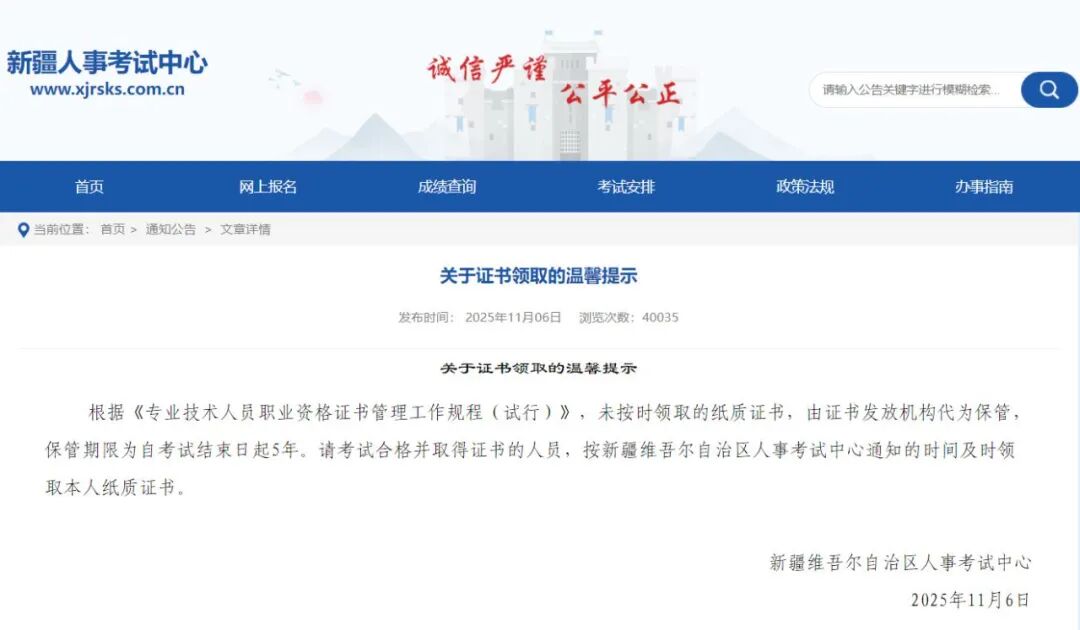 来源:新疆维吾尔自治区人事考试中心 关于证书领取的温馨提示