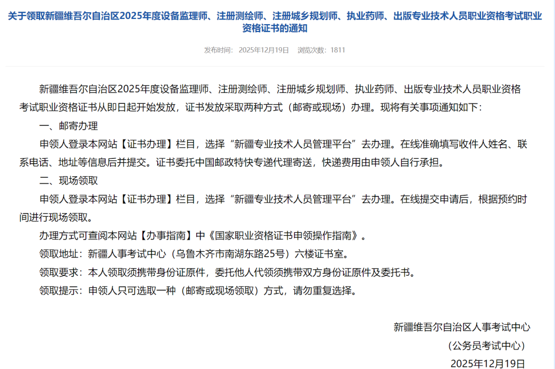 新疆维吾尔自治区2025年度设备监理师、注册测绘师、注册城乡规划师、执业药师、出版专业技术人员职业资格考试职业资格证书从即日起开始发放,证书发放采取两种方式(邮寄或现场)办理。现将有关事项通知如下: