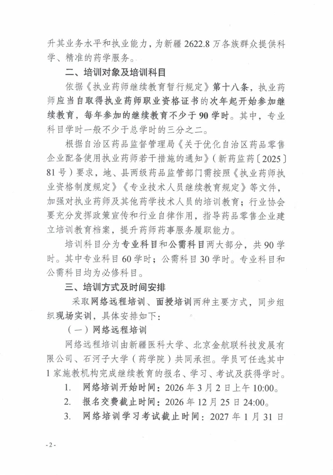 网络远程培训:由新疆医科大学、北京金航联科技发展有限公司、石河子大学(药学院)共同承担。学员可选择其中1家施教机构进行继续教育报名学习、考试、获得学时。