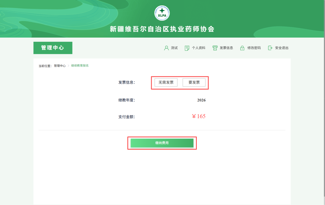 3、缴纳费用,选择是否需要发票。(发票信息请认真填写)