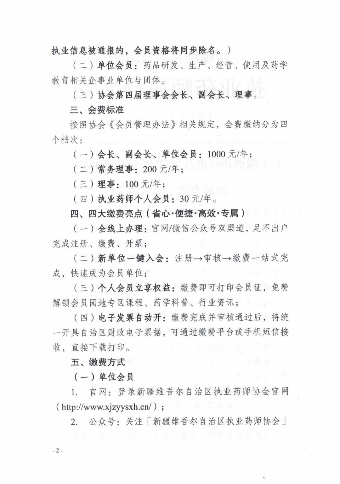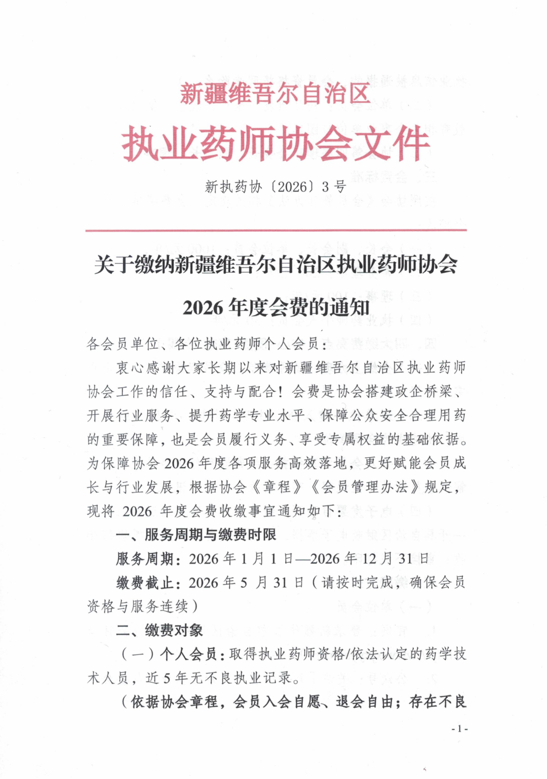 关于缴纳新疆维吾尔自治区执业药师协会2026年度会费的通知