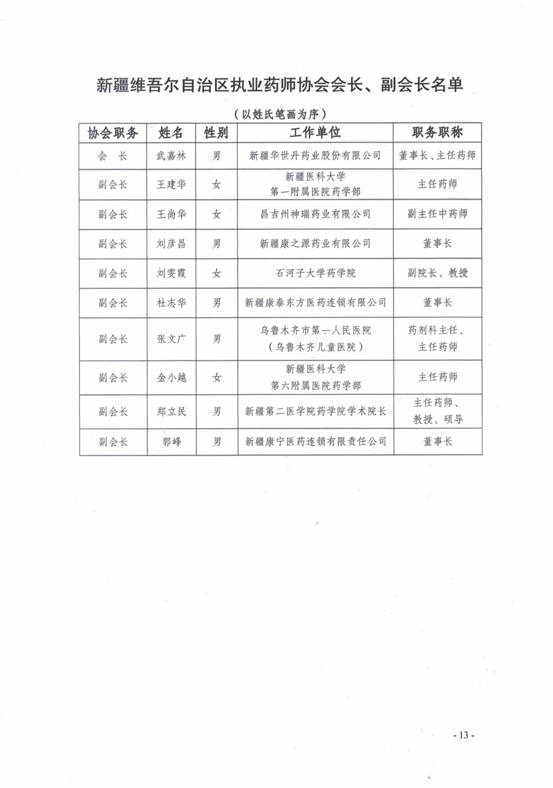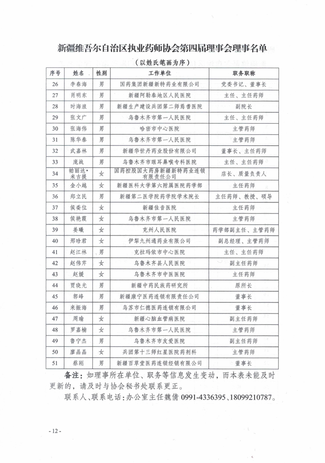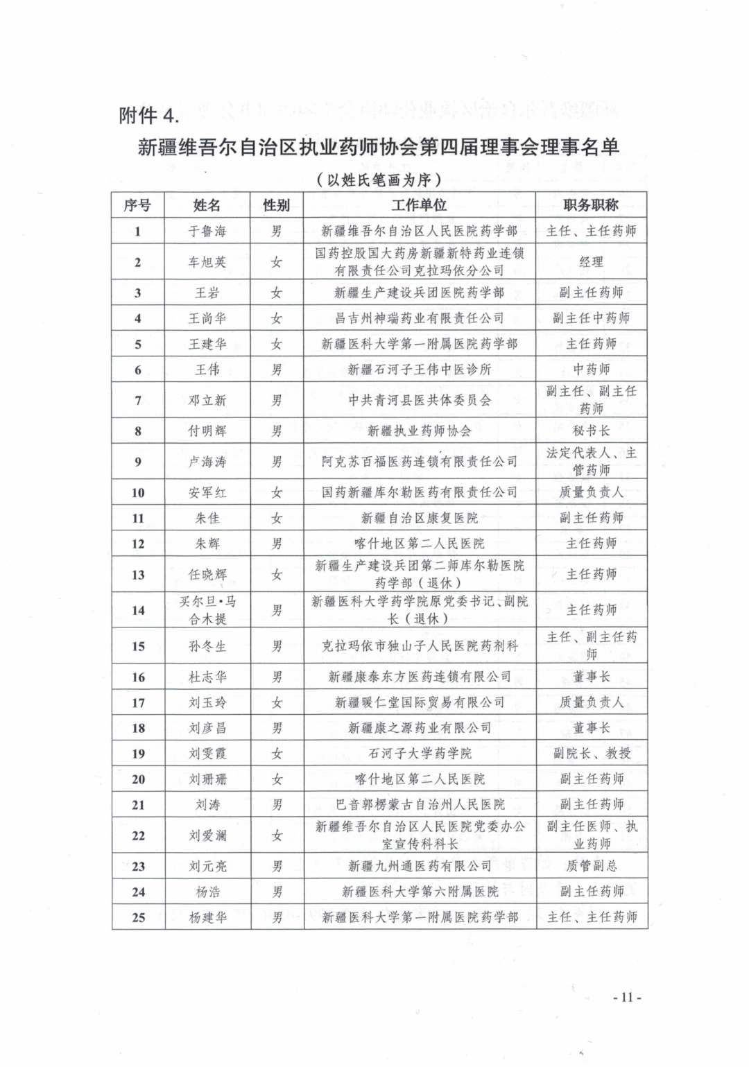 新疆维吾尔自治区执业药师协会第四届理事会、监事会组织构成